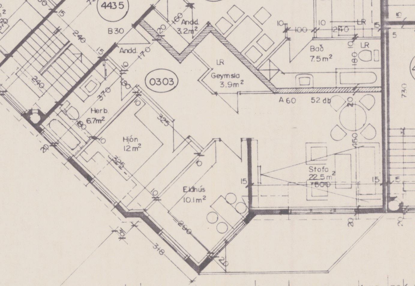 Svefnherbergi I: Í rými sem teiknað er sem geymsla á teikningu er búið að koma fyrir barnaherbergi.